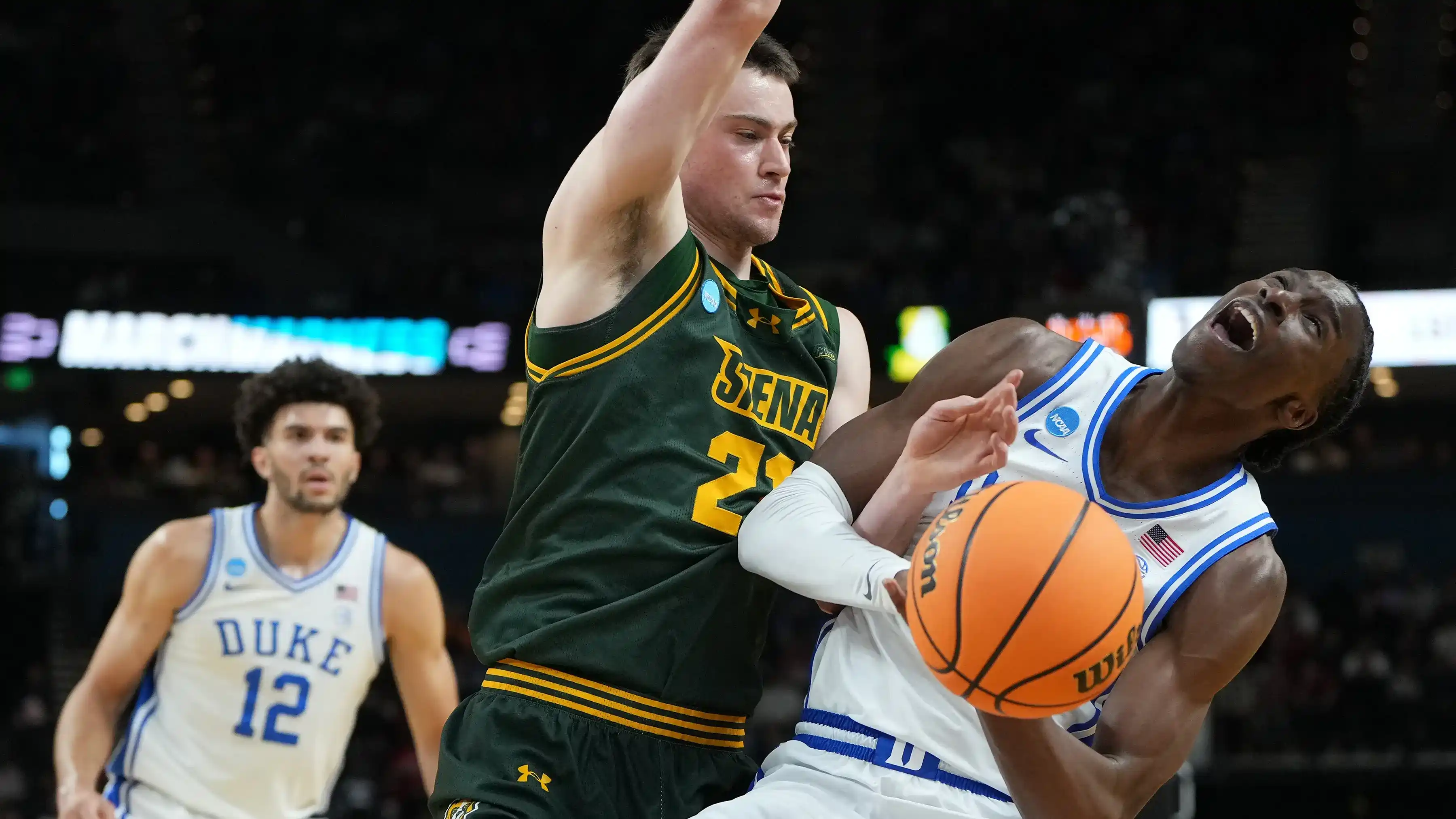 هذا العام، كادت جامعة ديوك أن تعيش هذا الكابوس أمام سيينا، بعد أن أنهى الشوط الأول متأخرًا 32-43، مع سيطرة مذهلة لفريق جيري ماكنمارا الذي تقدم بفارق وصل إلى 13 نقطة.