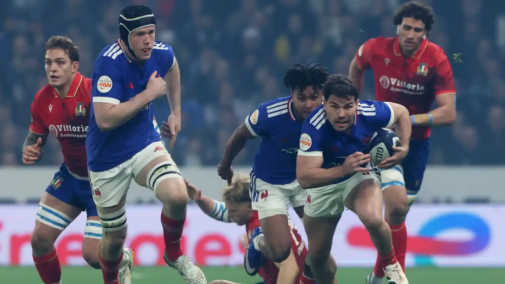 وتقدم فريق "لي بلو" بنتيجة 19-0 بفضل محاولات لويس بييل-بياري، وإيمانويل ميفو، وتوماس راموس، الذي تم استبداله في وقت متأخر في مركز صانع الألعاب بعد استبعاد ماثيو جاليبير من المباراة.