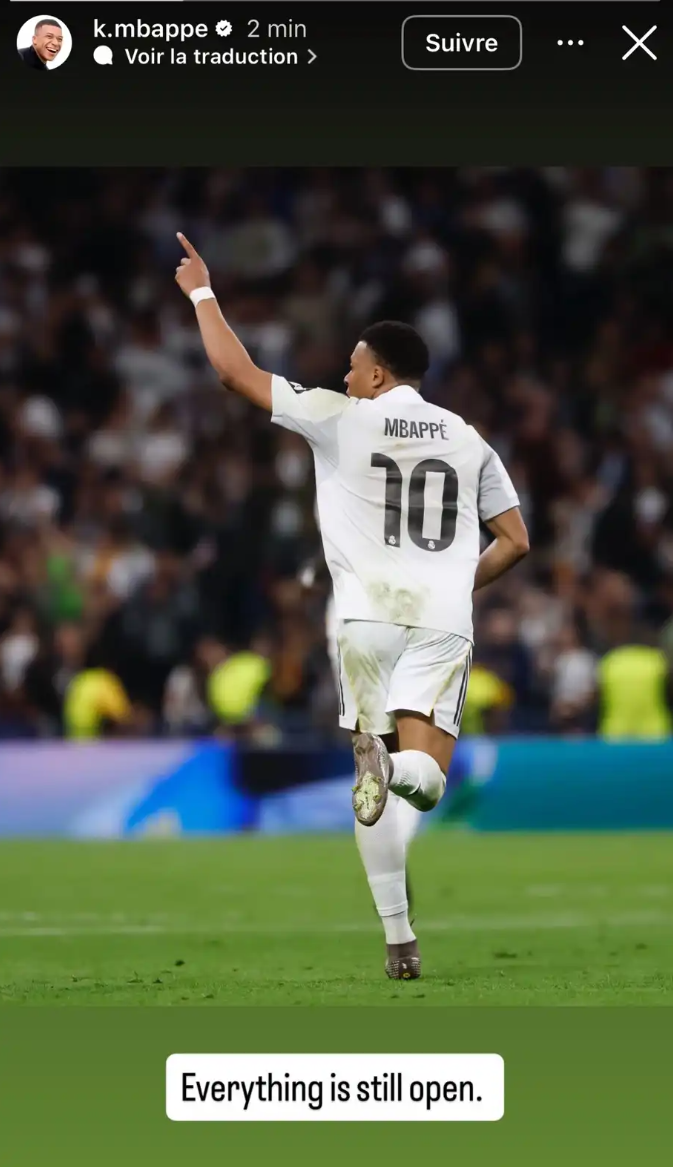 ونشر النجم الفرنسي صورة له من قلب المباراة معلقاً عليها بعبارة "كل شيء لا يزال ممكناً"، وهي الرسالة التي فسرها المتابعون بأنها وعد بالقتال حتى الرمق الأخير في "أليانز آرينا"، وتأكيد على أن شخصية ريال مدريد قادرة على قلب الموازين مهما بلغت صعوبة الظروف.